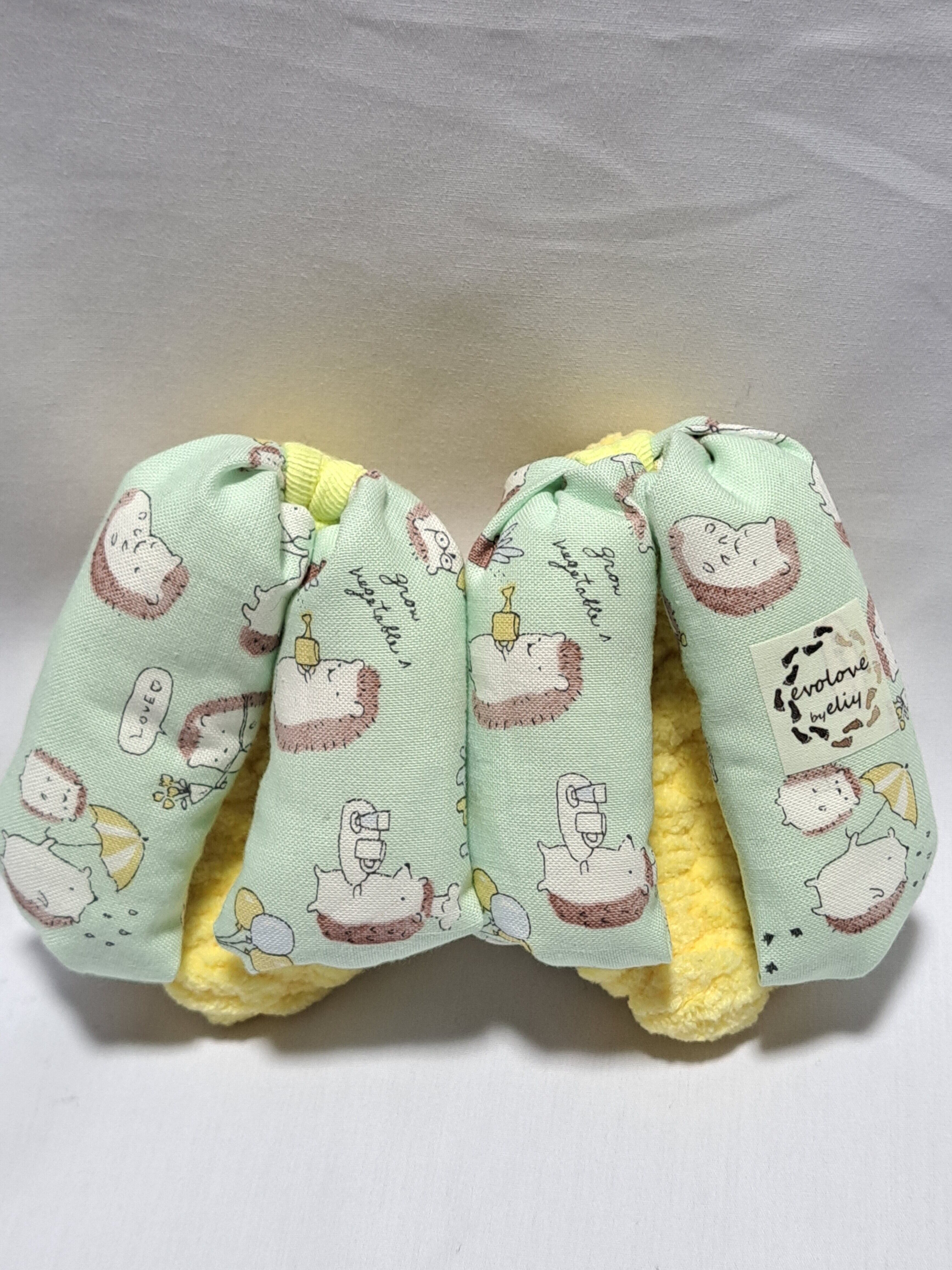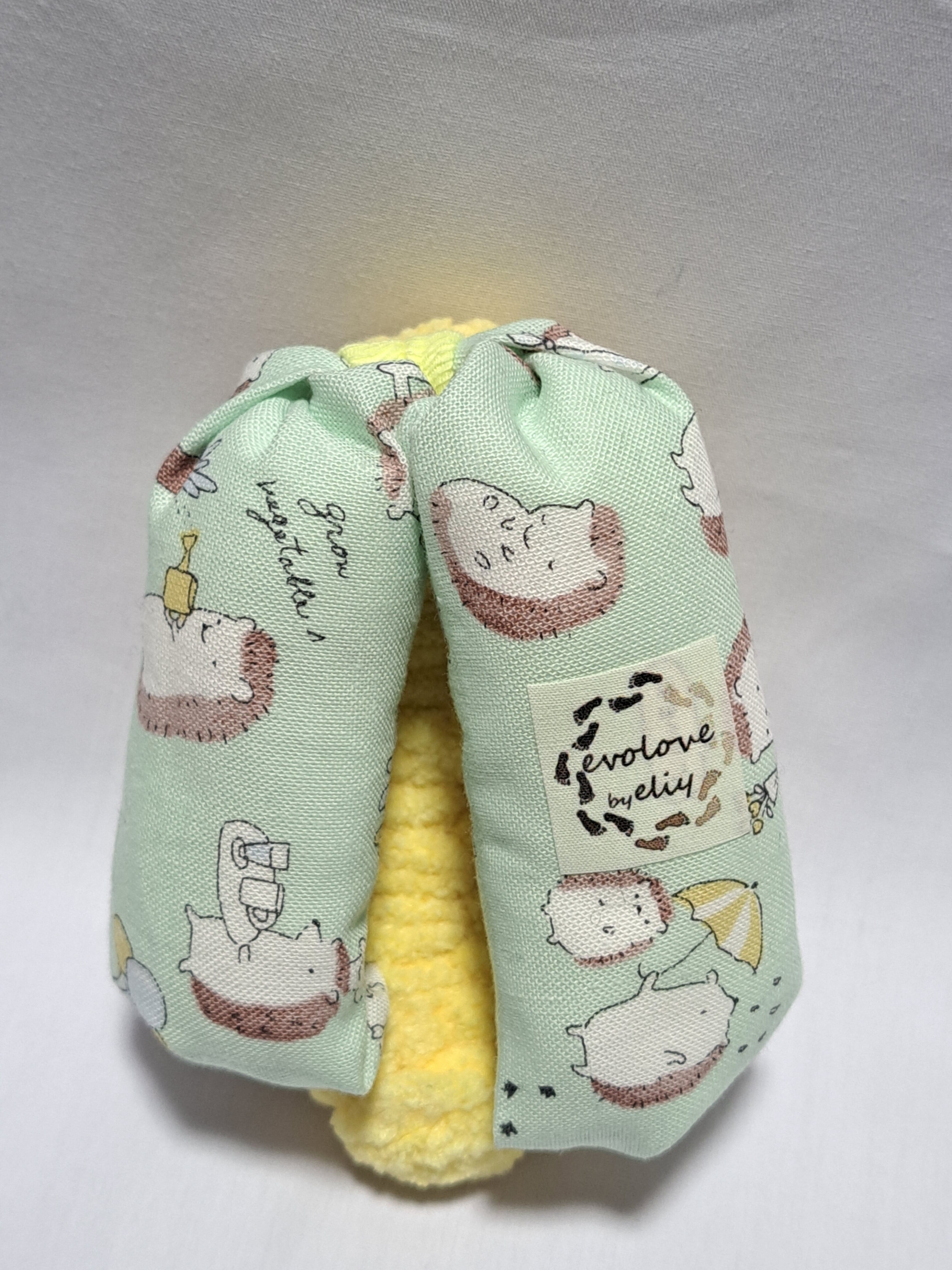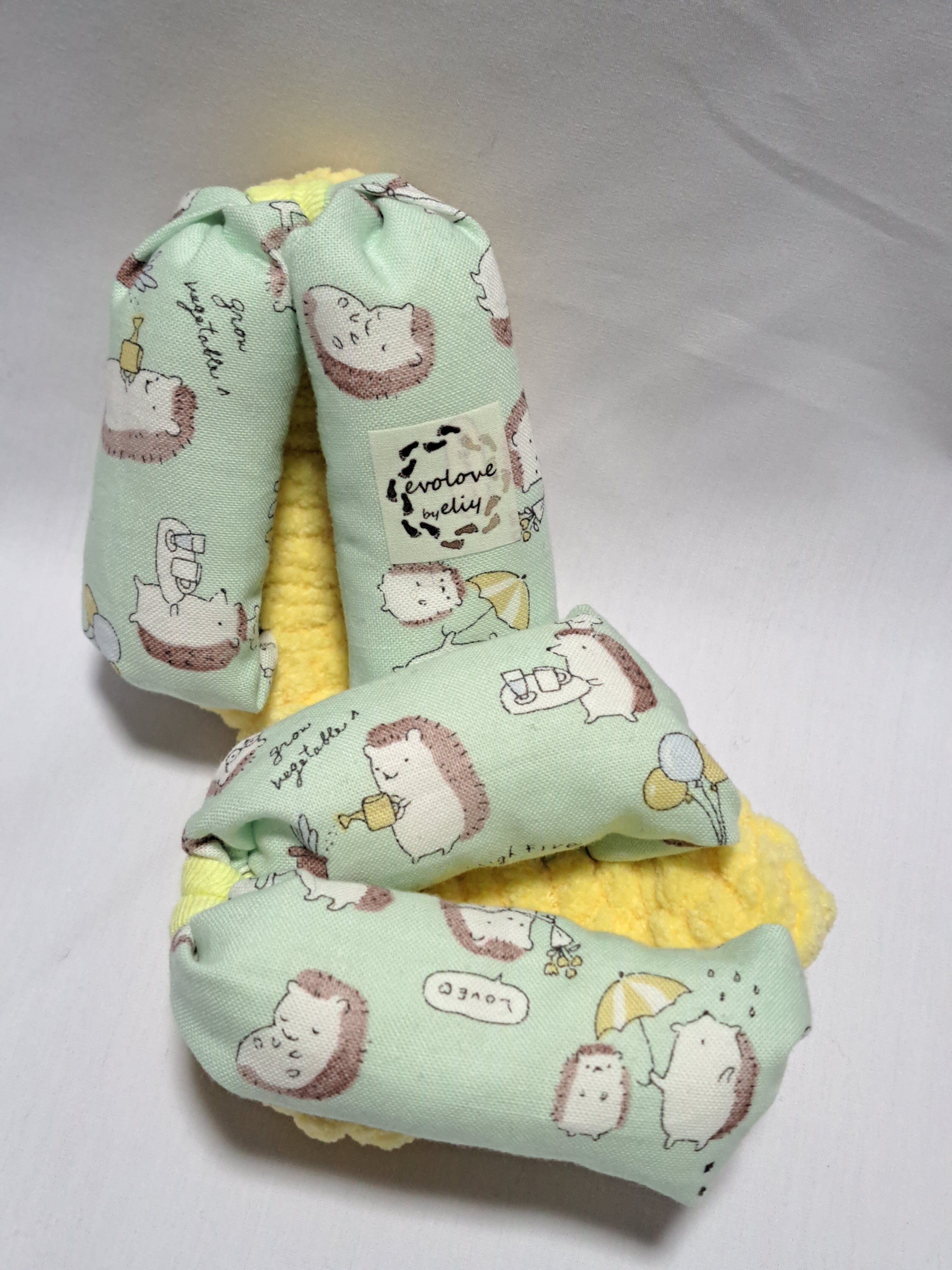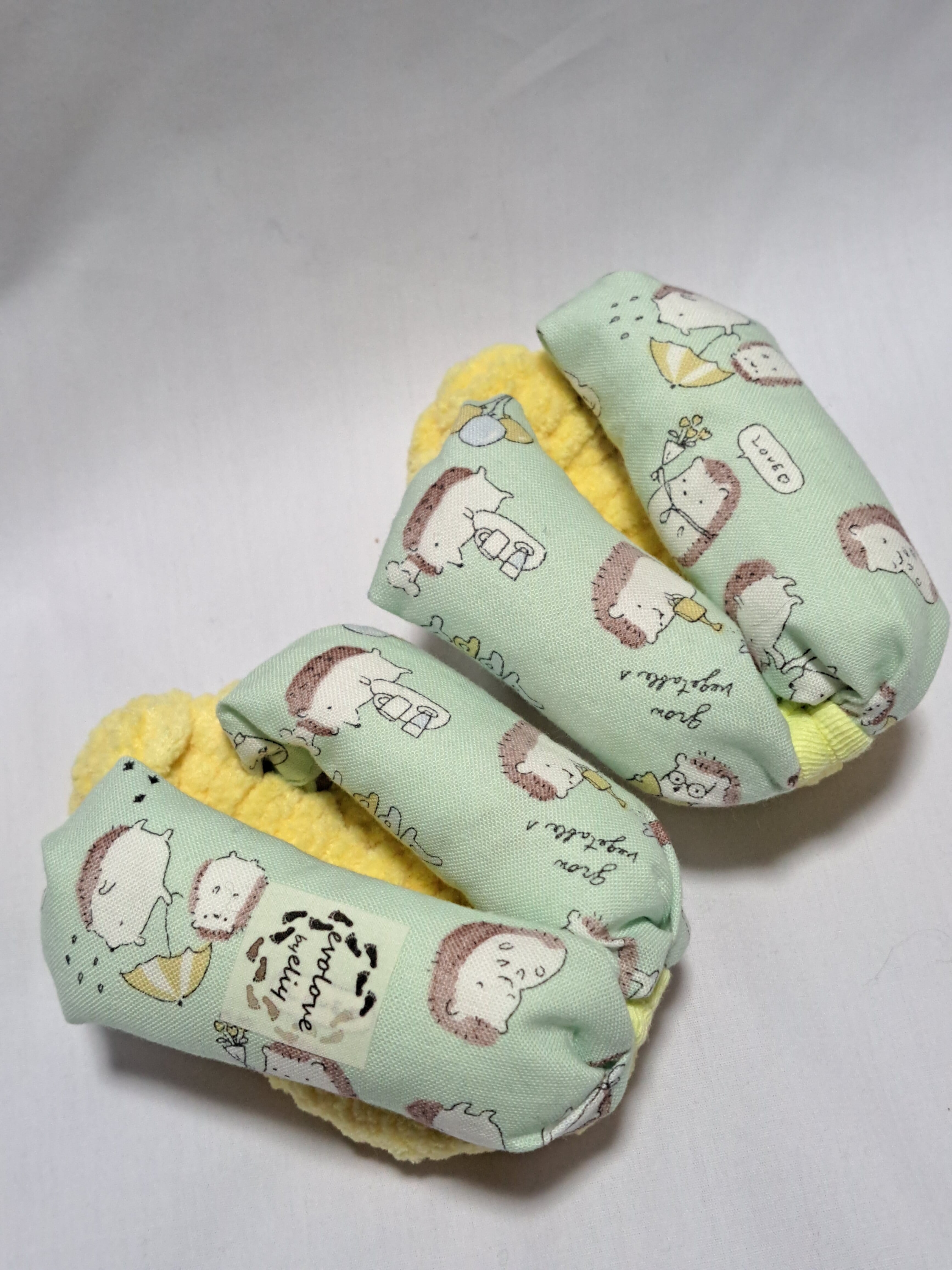 鼻緒が綿のエメラルドグリーン地に可愛いハリネズミのイラストが描かれております。