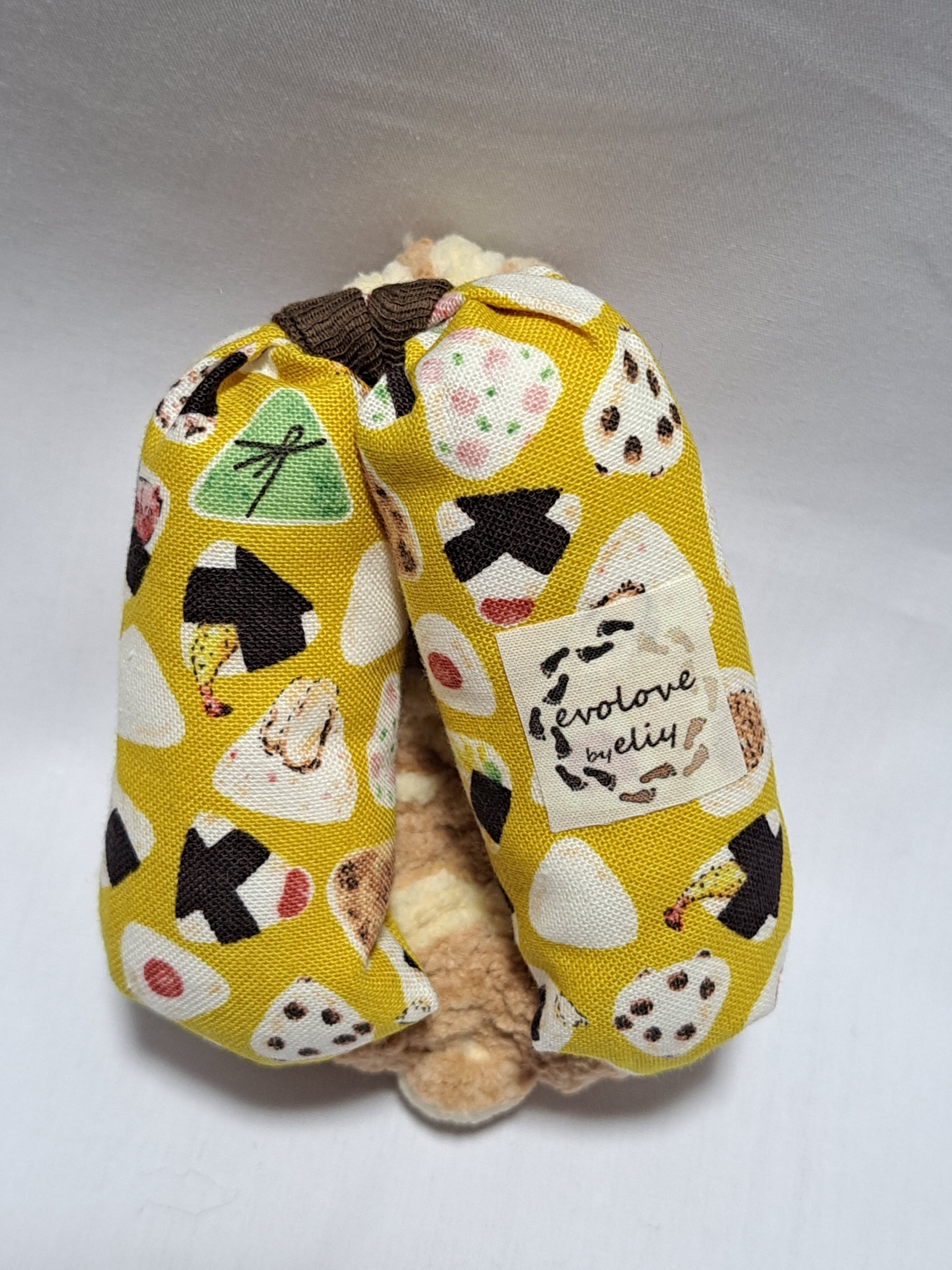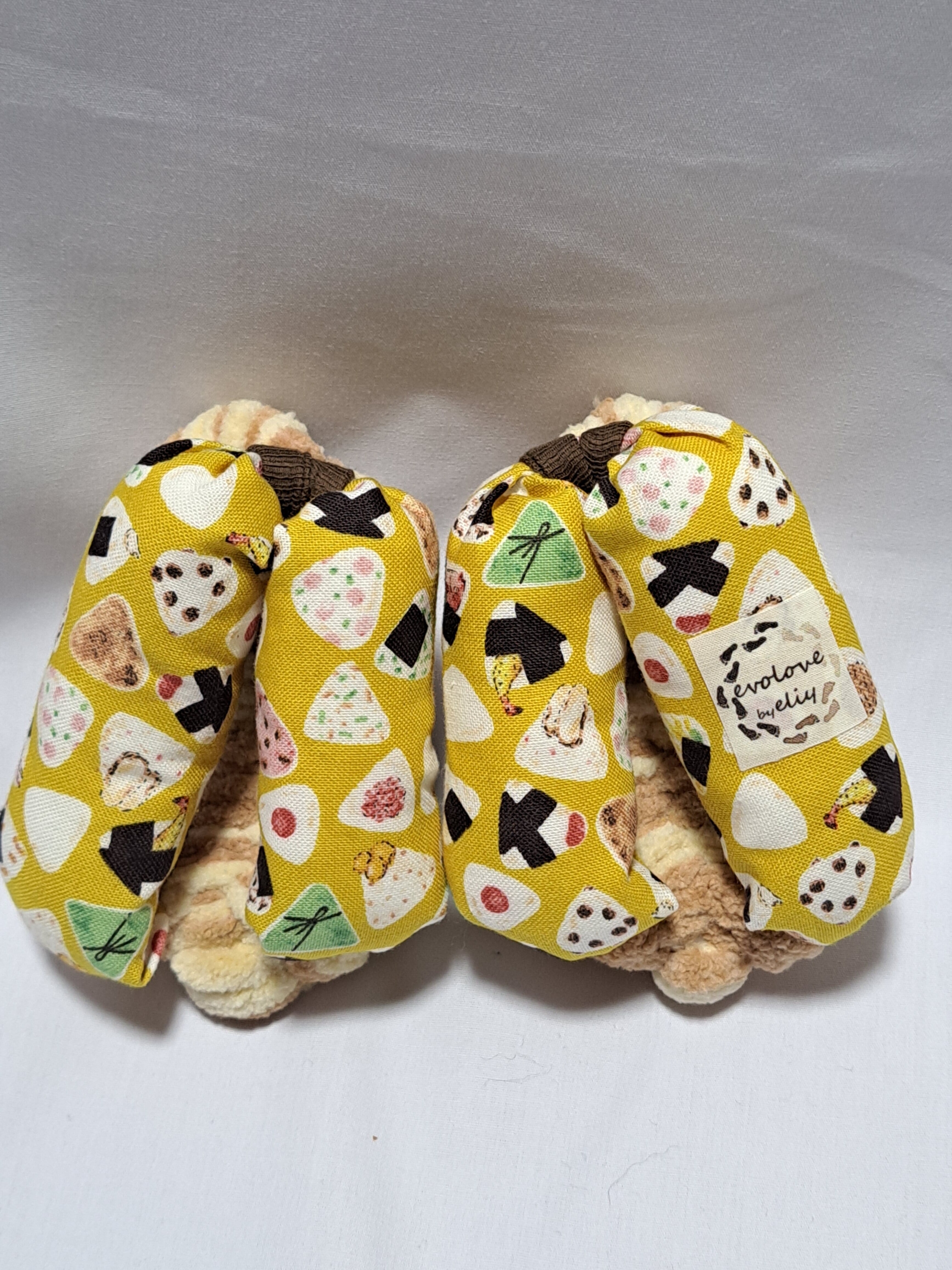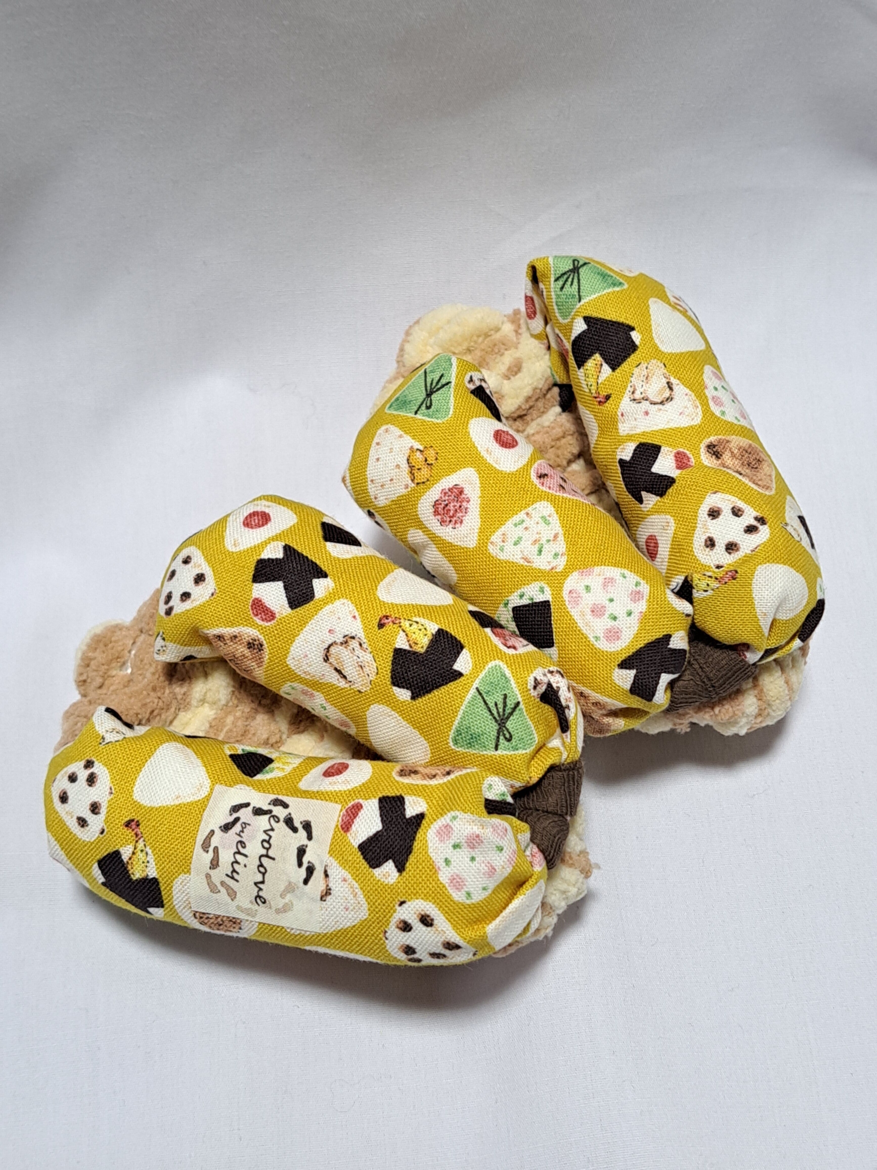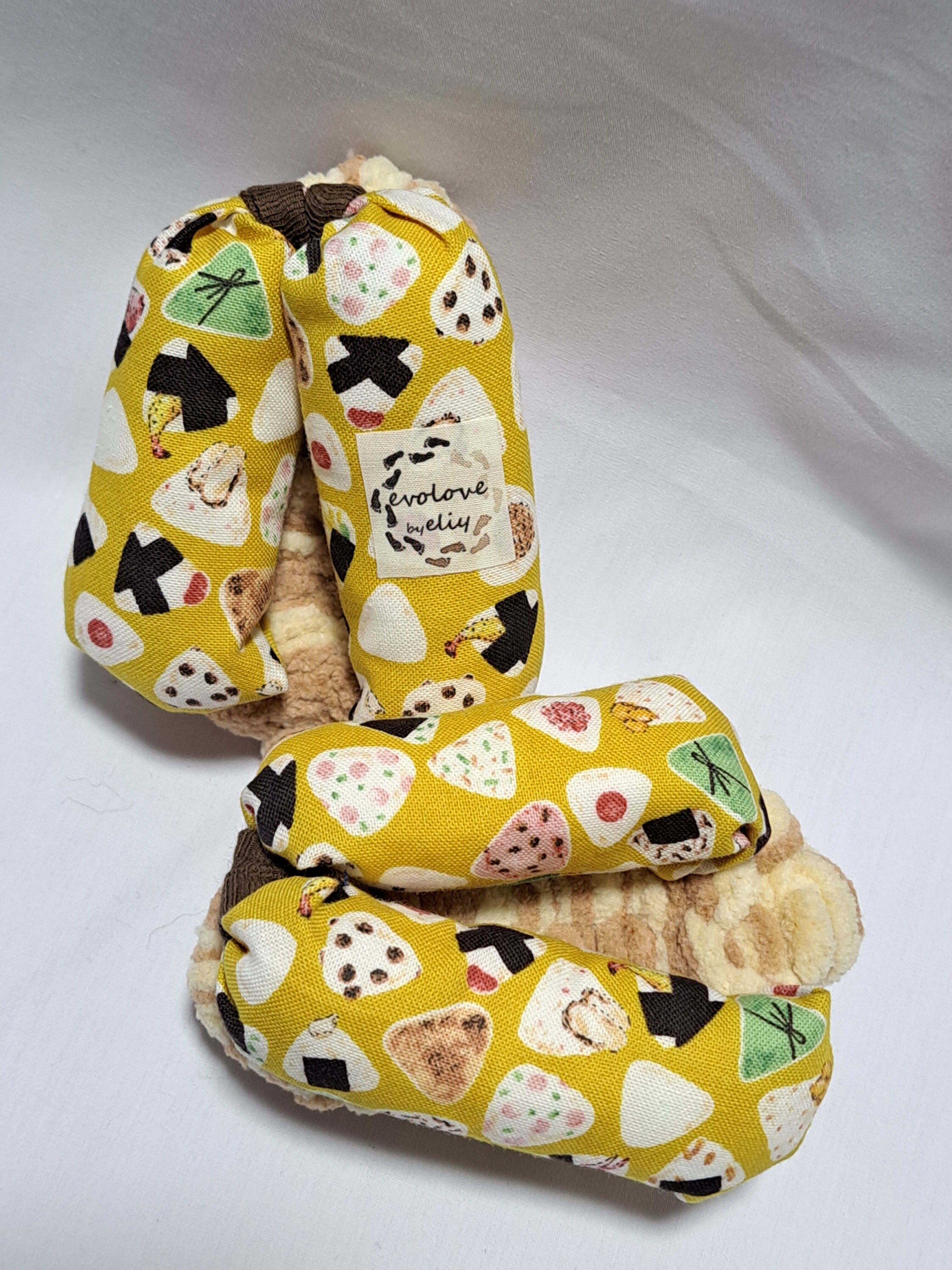 鼻緒が綿のカラシ色地におにぎりのイラストが描かれております。