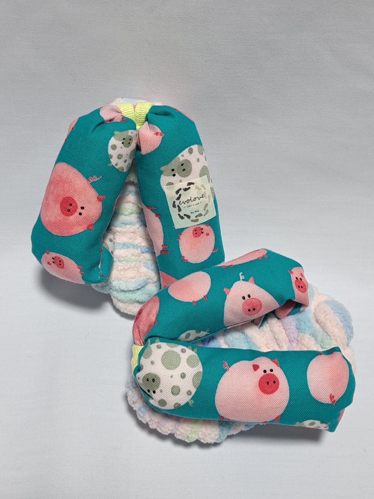 鼻緒が綿のブルーグリーン色地に可愛いぶたさんが描かれております。